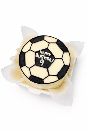 A fun and sporty bento cake designed like a classic football, finished with smooth Cream frosting and detailed Fondant accents—perfect for young football fans and birthday celebrations.