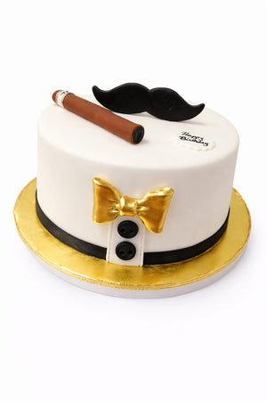 A classy Fondant-finished cake styled with a bow tie, buttons, and moustache accents, perfect for sophisticated birthdays and gentleman-themed celebrations.