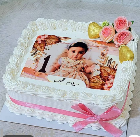 A charming Cream cake featuring your little one’s photo, adorned with elegant floral accents to make first birthdays extra special.