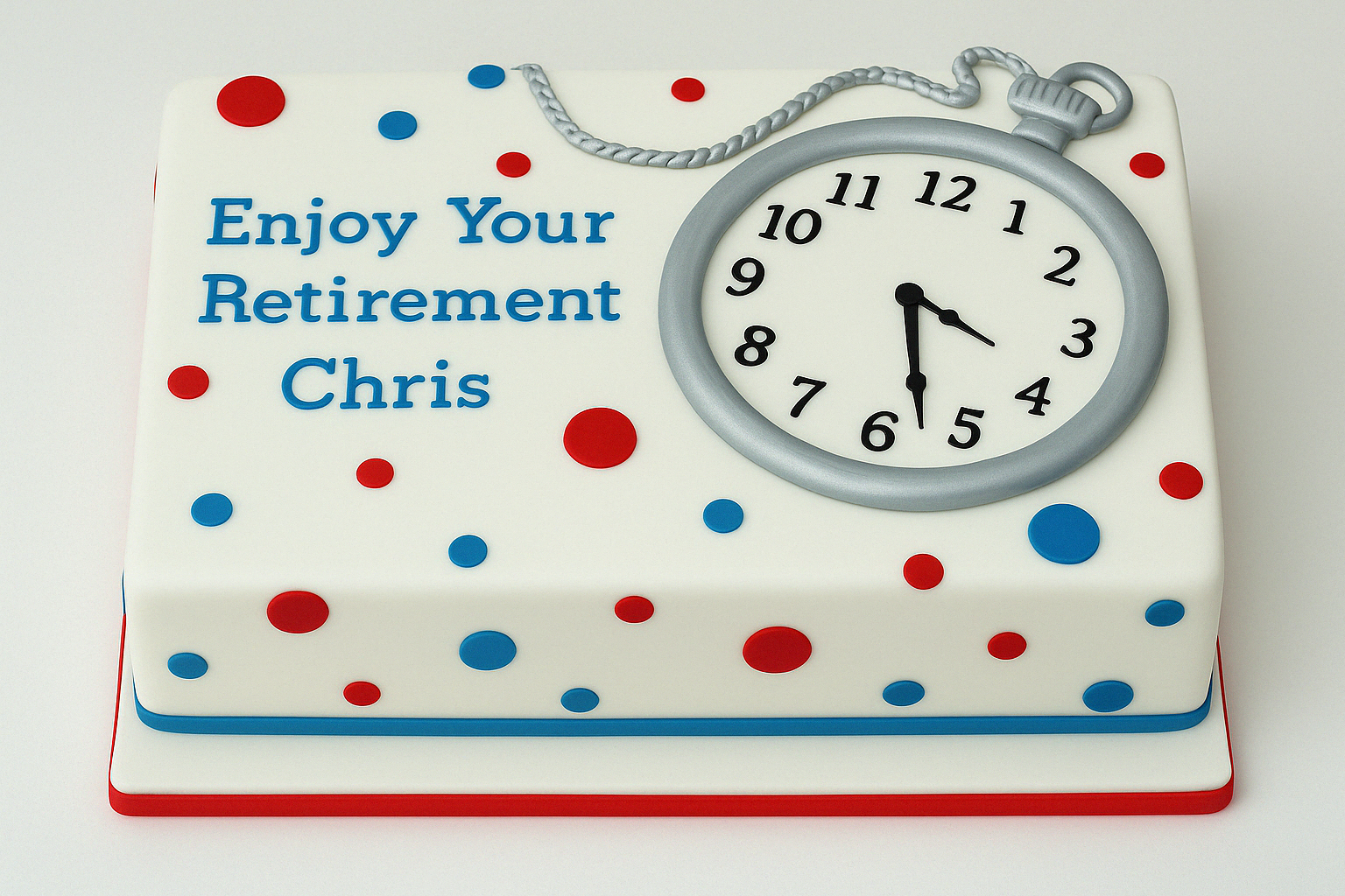 A charming retirement cake featuring a classic pocket watch design with playful polka dots and a personalised message to mark the start of a relaxed new chapter.