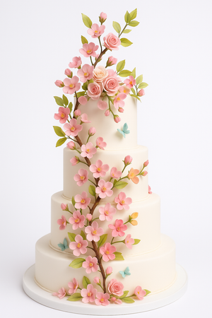 A graceful multi-tier cake adorned with delicate pink blossoms and soft pastel accents, creating a romantic garden-inspired look perfect for elegant celebrations.