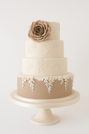 A graceful multi-tier Combination cake adorned with delicate lace detailing and cascading floral accents, crowned with a statement handcrafted rose for a timeless celebration look.