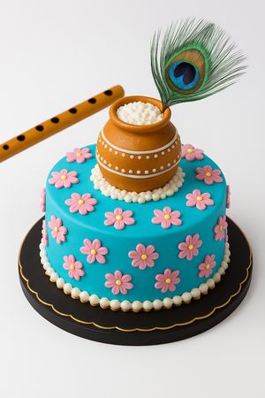 A beautifully handcrafted cake featuring a traditional matki, peacock feather, flute, and delicate floral accents to celebrate the divine spirit of Janmashtami.