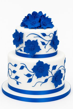 An elegant two-tier Fondant cake adorned with handcrafted royal blue floral patterns, perfect for weddings, anniversaries, and luxurious celebrations.