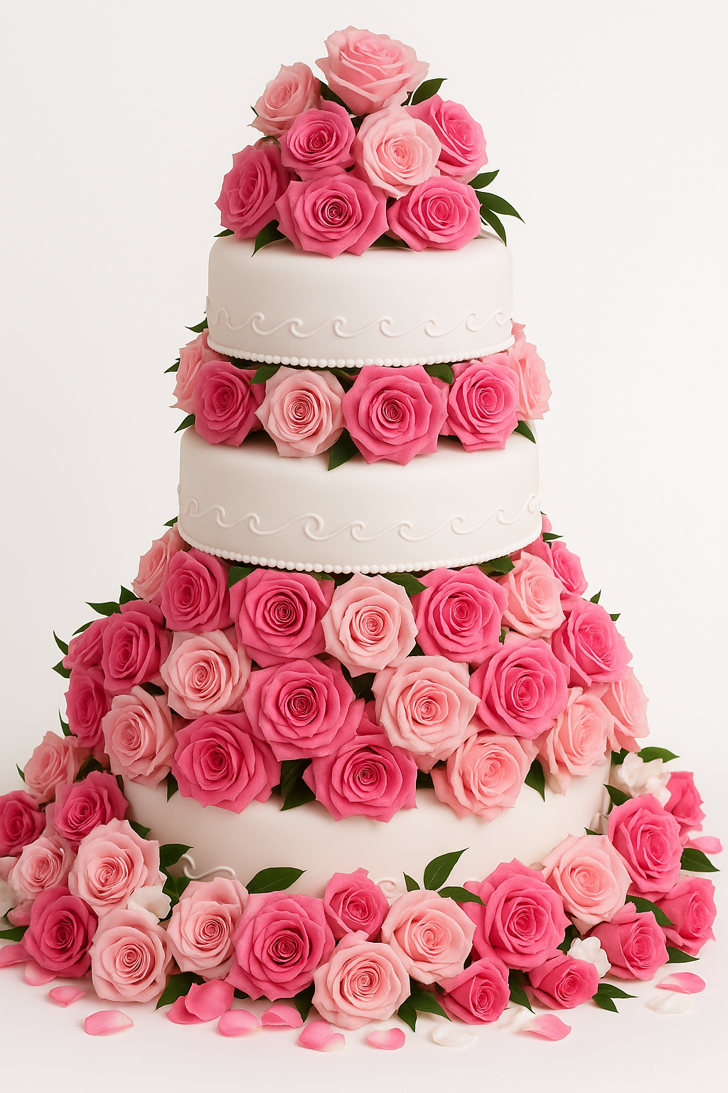 A romantic multi-tier Cream cake adorned with cascading pink roses, perfect for elegant celebrations and weddings.